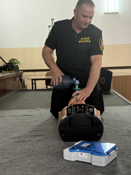 Pokaz przeprowadził nasz strażnik posiadający uprawnienia kwalifikowanej pierwszej pomocy z pomocą strażniczki. Funkcjonariusz w sposób przystępny omówił jak należy się zachować i reagować w sytuacjach zagrożenia życia i zdrowia.