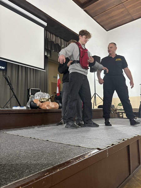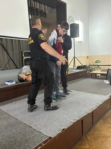 Na spotkaniu uczniowie dowiedzieli się w jaki sposób położyć osobę nieprzytomną w pozycji bezpiecznej i jak wykonać resuscytację krążeniowo-oddechową.