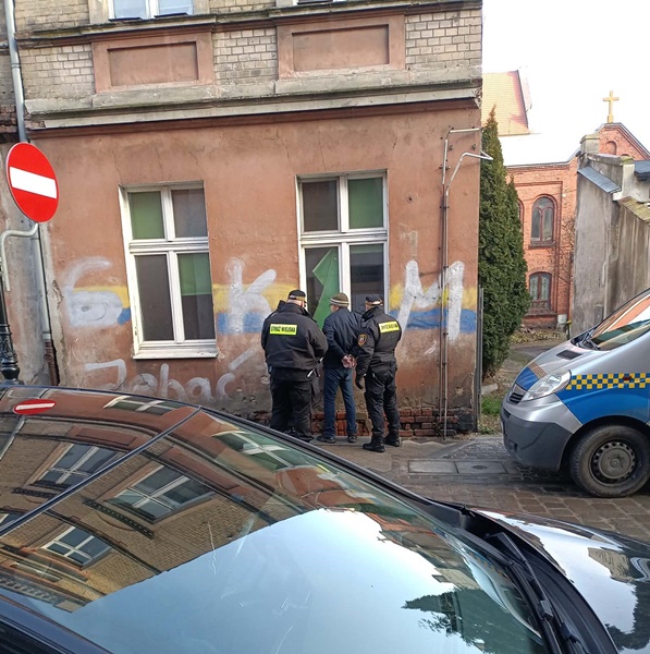 Do strażników patrolujących miasto podeszła kobieta, która poinformowała municypalnych, że w stronę ulicy Starej przemieszcza się mężczyzna z niebezpiecznym narzędziem w ręku, prawdopodobnie z nożem. Funkcjonariusze udali się we wskazanym kierunku. W tym czasie otrzymali ponowną informację od innego przechodnia, który pokazał im filmik w telefonie z nagraniem jak zachowuje się dany mężczyzna. Na nagraniu wyraźnie było widać, że jest on agresywny.
