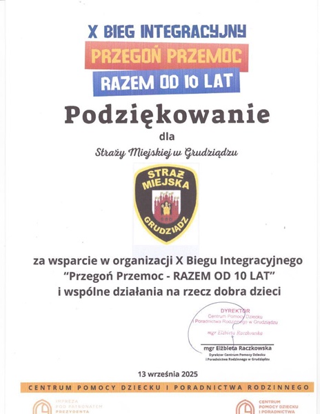 Na ręce Komendanta Straży Miejskiej w Grudziądzu wpłynęło podziękowanie za wsparcie w organizacji X Biegu Integracyjnego „Przegoń przemoc”.